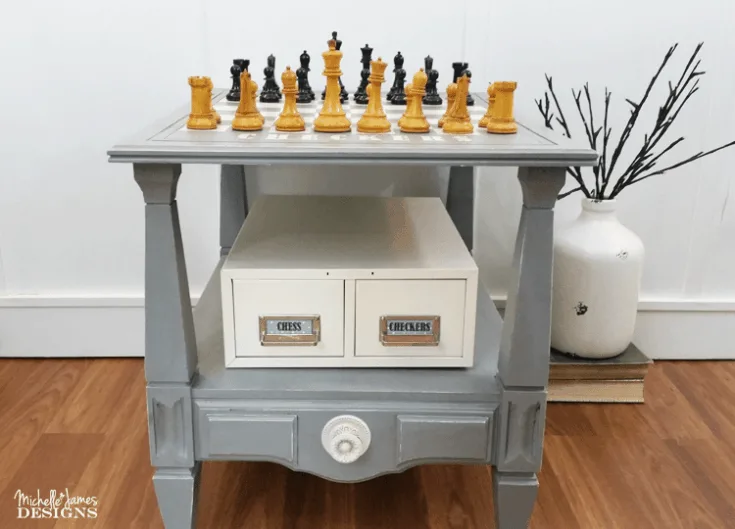The major part of this table was sprayed with a paint sprayer but the game table squares and text were created with stencils and spray paint as well as the metal file drawer for all of the pieces. Wood and metal are perfect for spray paint.